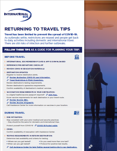 Talk to our team today to find out how International SOS’ consulting services can help you shape and drive an effective Return to Travel agenda for your global workforce.